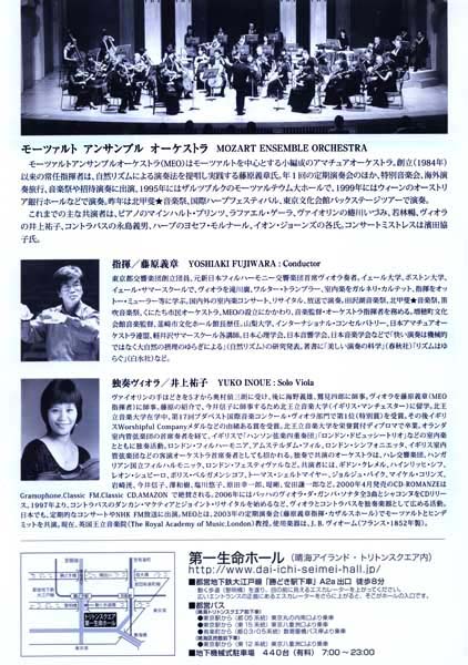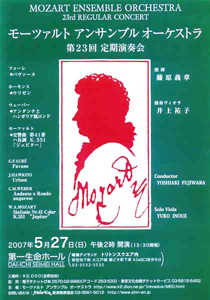● 第23回定期演奏会 第一生命ホール(晴海トリトンスクウェア) 14時開演(13:30開場) フォーレ 「パヴァーヌ」 ジョン・ホーキンス 「Urizen」(管弦楽版 日本初演) ウェーバー 「アンダンテとハンガリー風ロンド」 モーツァルト 交響曲 第41番「ジュピター」 入場料: 2,000円(全席自由) チケット前売: 電子チケットぴあ 0570-02-9990 (Pコード 253-533) 東京文化会館チケットサービス 03-5815-5452 お問い合わせ: 新演奏家協会 03-3561-5012