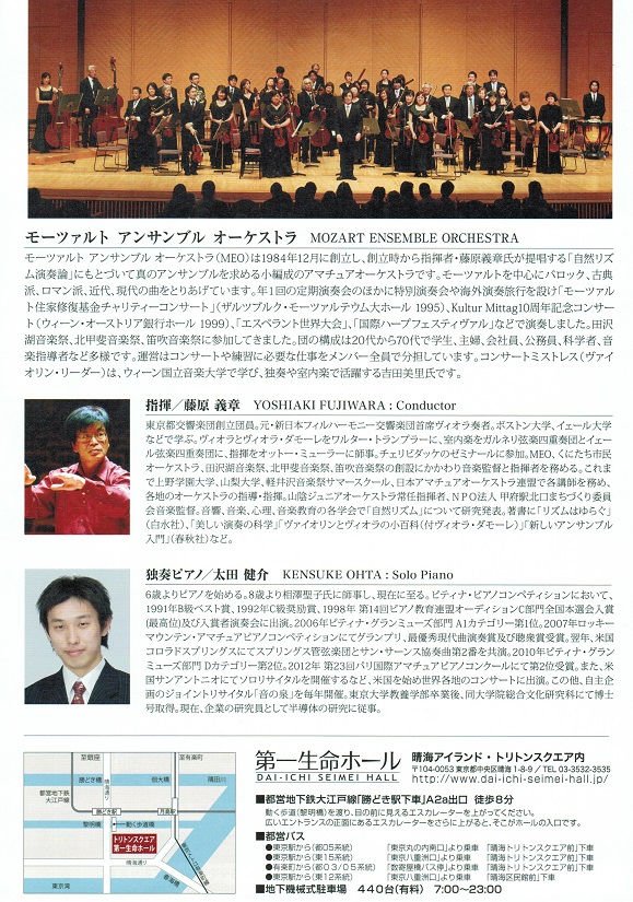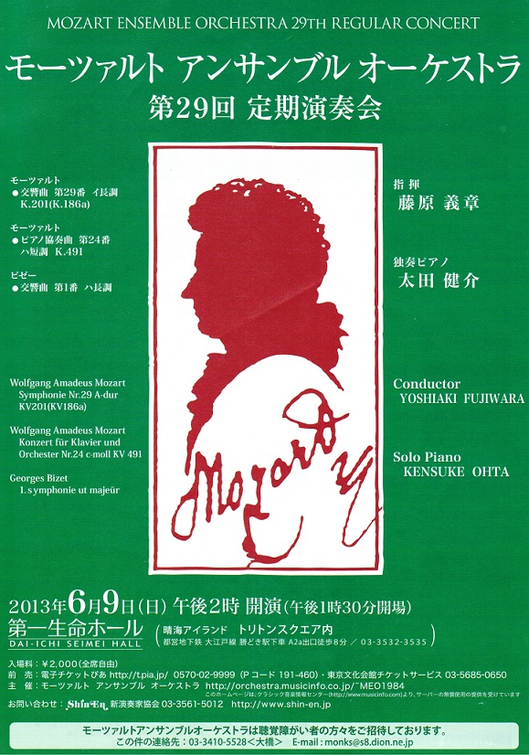 ● 第29回定期演奏会 第一生命ホール 14時開演(13:30開場) モーツァルト 交響曲第29番 イ長調 K.201 モーツァルト ピアノ協奏曲第24番 ハ短調 K.491 ビゼー 交響曲第1番ハ長調 入場料: 2,000円(全席自由) チケット前売: 電子チケットぴあ 0570-02-9999 (Pコード163-475) 東京文化会館チケットサービス 03-5685-0650 お問い合わせ: 新演奏家協会 03-3561-5012