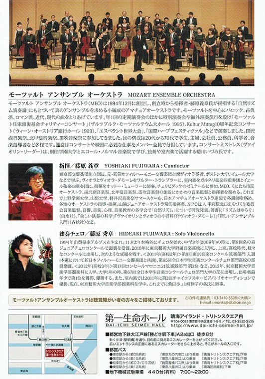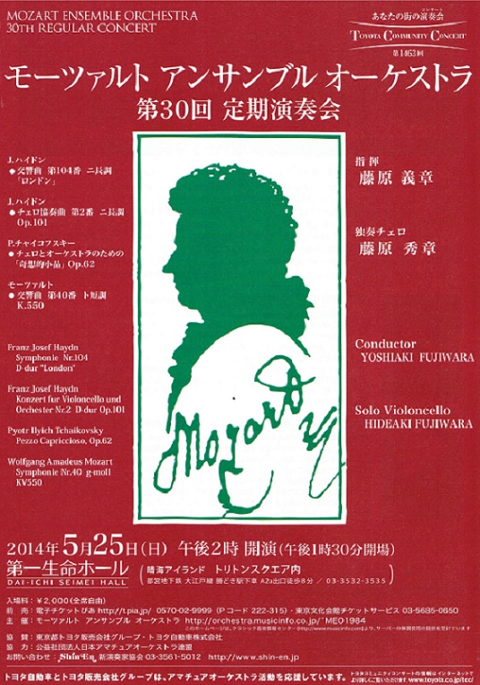 ● 第30回定期演奏会 第一生命ホール 14時開演(13:30開場) J.ハイドン 交響曲 第104番 ニ長調 「ロンドン」 J.ハイドン チェロ協奏曲 第2番 ニ長調 Op.101 チャイコフスキー チェロとオーケストラのための「奇想的小品」Op.62 モーツァルト 交響曲 第40番 ト短調 K.550 入場料: 2,000円(全席自由) チケット前売: 電子チケットぴあ 0570-02-9999 (Pコード222-315) 東京文化会館チケットサービス 03-5685-0650 お問い合わせ: 新演奏家協会 03-3561-5012