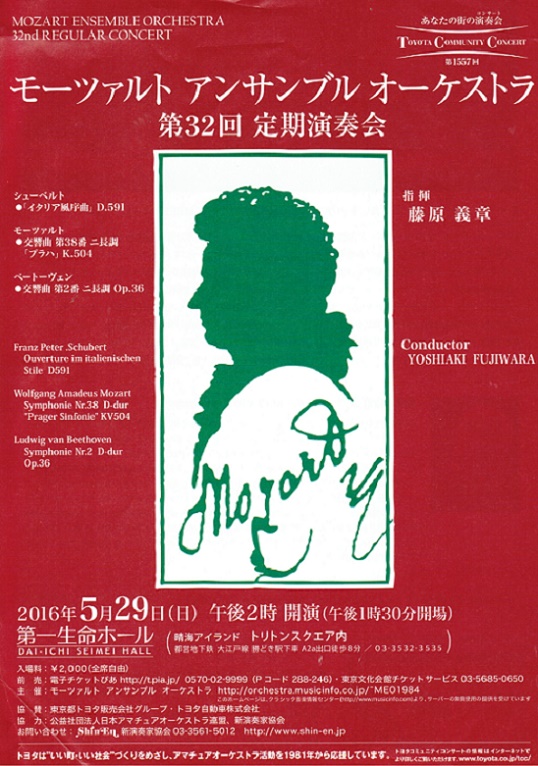 ● 第32回定期演奏会 第一生命ホール 14時開演(13:30開場) シューベルト イタリア風序曲 D.591 モーツァルト 交響曲第38番 二長調「プラハ」K.504 ベートーヴェン 交響曲第2番 ニ長調 作品36 入場料: 2,000円(全席自由) チケット前売: 電子チケットぴあ 0570-02-9999 (Pコード288-246) 東京文化会館チケットサービス 03-5685-0650 お問い合わせ: 新演奏家協会 03-3561-5012