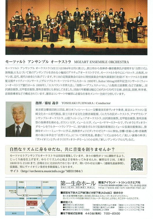 ● 第35回定期演奏会 第一生命ホール 14時開演(13:30開場) モーツァルト 歌劇「ドン・ジョヴァンニ」序曲 K.527 モーツァルト 交響曲第36番 ハ長調 「リンツ」K.425 ドヴォルジャーク チェコ組曲 ニ長調 Op.39 ベートーヴェン 交響曲第1番 ハ長調 Op.21 入場料: 2,000円(全席自由) チケット前売: チケットぴあ http://t.pia.jp/ 0570-02-9999 (Pコード142-878) CNプレイガイド 0570-08-9990 www.cnplayguide.com お問い合わせ: 新演奏家協会 03-3561-5012 http://www.shin-en.jp