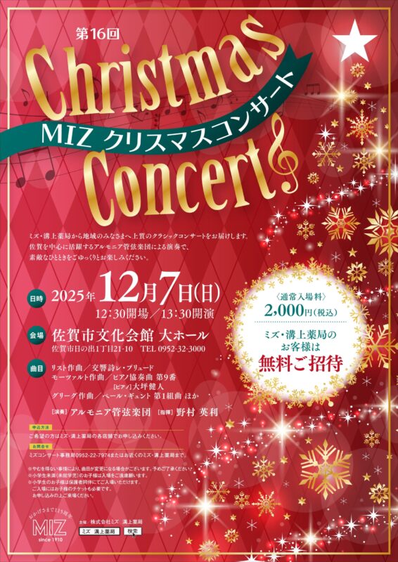 ■2024年12月8日(日) ■第15回 MIZ クリスマスコンサート 「鎌田 實の「がんばらない健康長寿実践塾」第17回講演会 & 2024クリスマスコンサート」より ■佐賀市文化会館大ホール ■プログラム サン=サーンス/ヴァイオリン協奏曲第3番 ロ短調 作品61 ヴァイオリン独奏:北坂 成希 グノー/9つの管楽器のための小交響曲 変ロ長調 ヴィヴァルディ/合奏協奏曲集『調和の霊感』作品3より 第10番ロ短調 RV580 (4つのヴァイオリンとチェロのための協奏曲) ベートーヴェン/ピアノ、ヴァイオリン、チェロと管弦楽のための協奏曲 ハ長調 作品56 ピアノ独奏:中山 智晴、ヴァイオリン独奏:松岡 祐美、チェロ独奏:崔 承彦 アンコール ベートーヴェン/劇付随音楽「アテネの廃墟」よりトルコ行進曲 ■指 揮:久原 興民 ■管弦楽:アルモニア管弦楽団 ■主催:溝上薬局 |