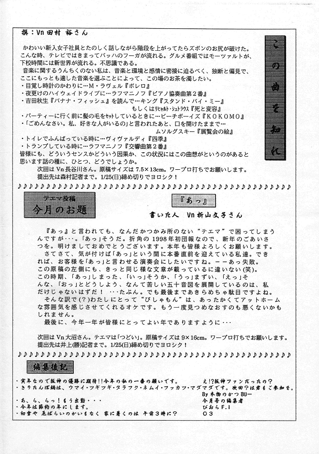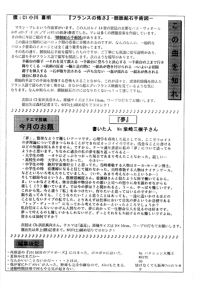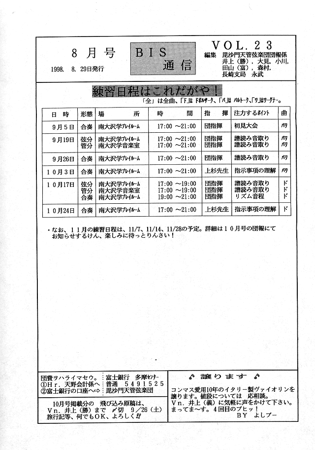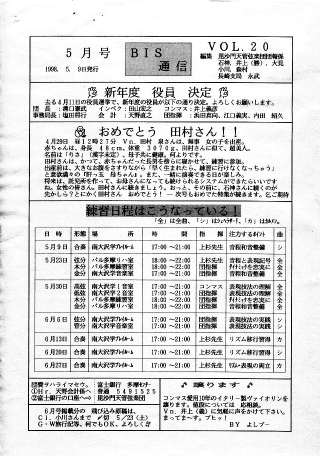 練習日程・Vn田村 泉さんご出産