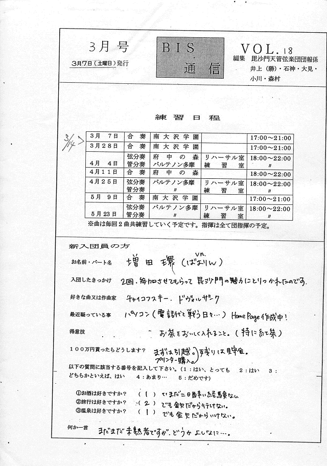 練習日程・新入団員紹介(Vn:増田さん)